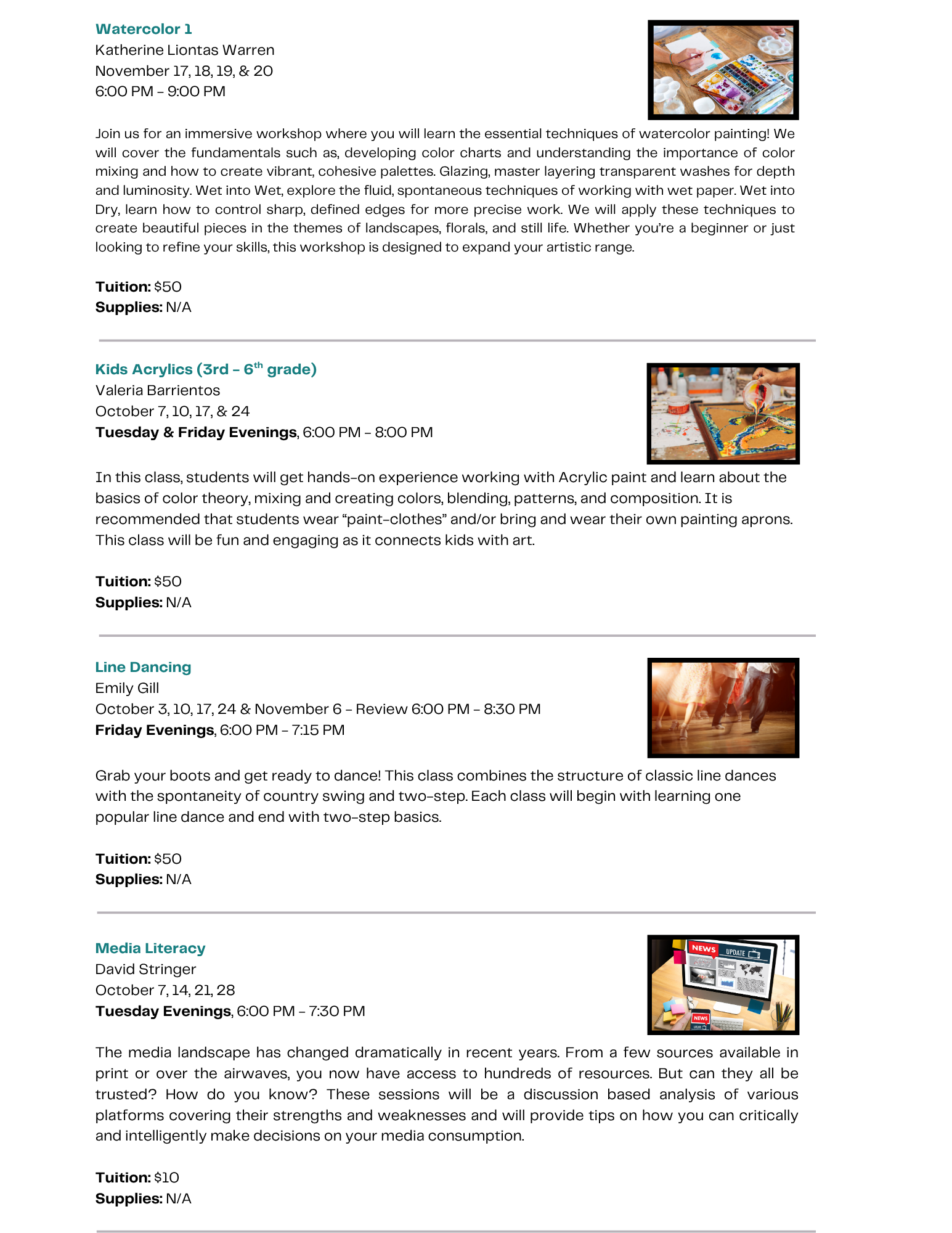 Supply fees are listed along with each course description, and supply lists will be shared with enrolled students before the start of classes. Some classes may require you to bring your own supplies, while others may require you to pay a small supply fee.