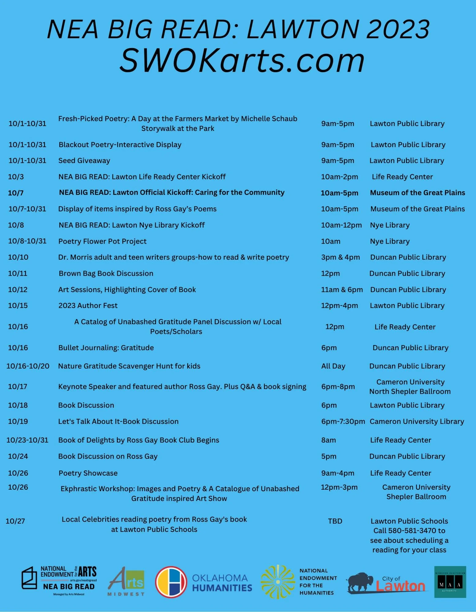 Lawton, Oklahoma, is honored to be one of the sixty-two communities nationwide participating in the 2023-2024 NEA Big Read. The city has been awarded a grant of $20,000 to support this endeavor. Throughout the entire month of October, our community will come together to celebrate the "Catalogue of Unabashed Gratitude" with a rich calendar of events.