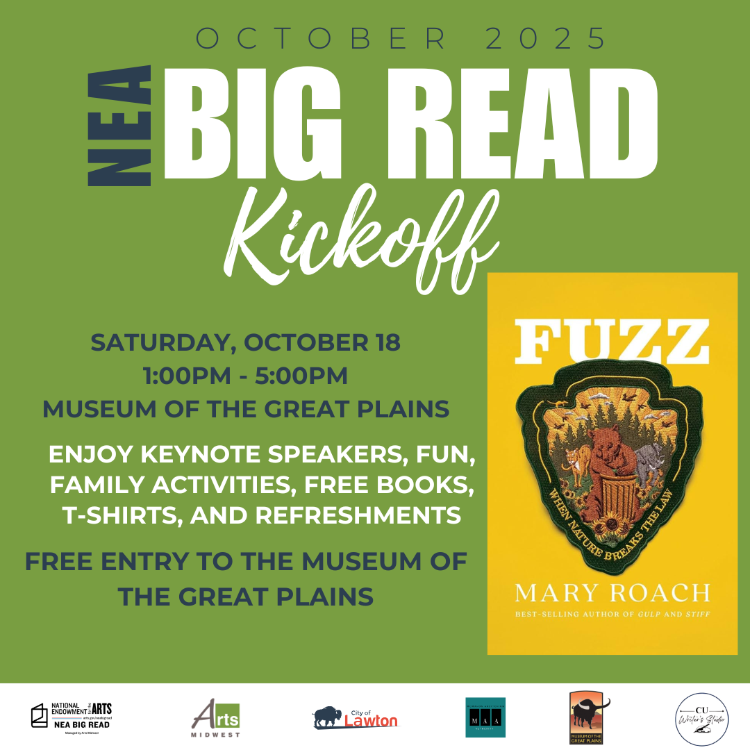 The McMahon Auditorium Authority, in partnership with the City of Lawton Arts and Humanities Division, is thrilled to announce the 2025 NEA Big Read book selection — Fuzz: When Nature Breaks the Law by best-selling author Mary Roach. The NEA Big Read kickoff event is happening on October 18, from 1:00pm-5:00pm at the Museum of the Great Plains. Citizens can expect several speakers, activities for children, and book giveaways. This community-wide reading initiative will take place from October 18 through November, featuring a lineup of events including book discussions, educational programs, and creative activities. The program will culminate with a special author discussion with Mary Roach on December 5, 2025. During this time, readers across Lawton, Duncan, and Fort Sill will explore the witty and thought-provoking pages of Fuzz, which delves into the curious and often comical crossroads of wildlife and human law enforcement.
