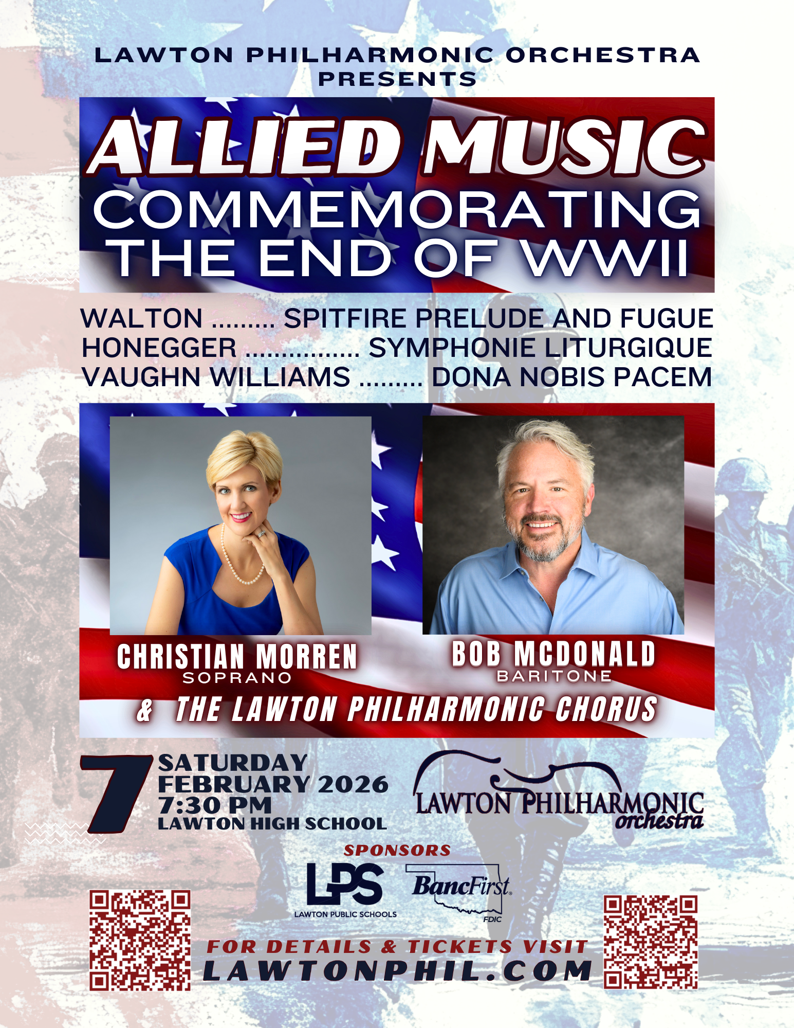 The Lawton Philharmonic Orchestra presents ALLIED MUSIC, a powerful and moving concert honoring the music and legacy surrounding the end of World War II.