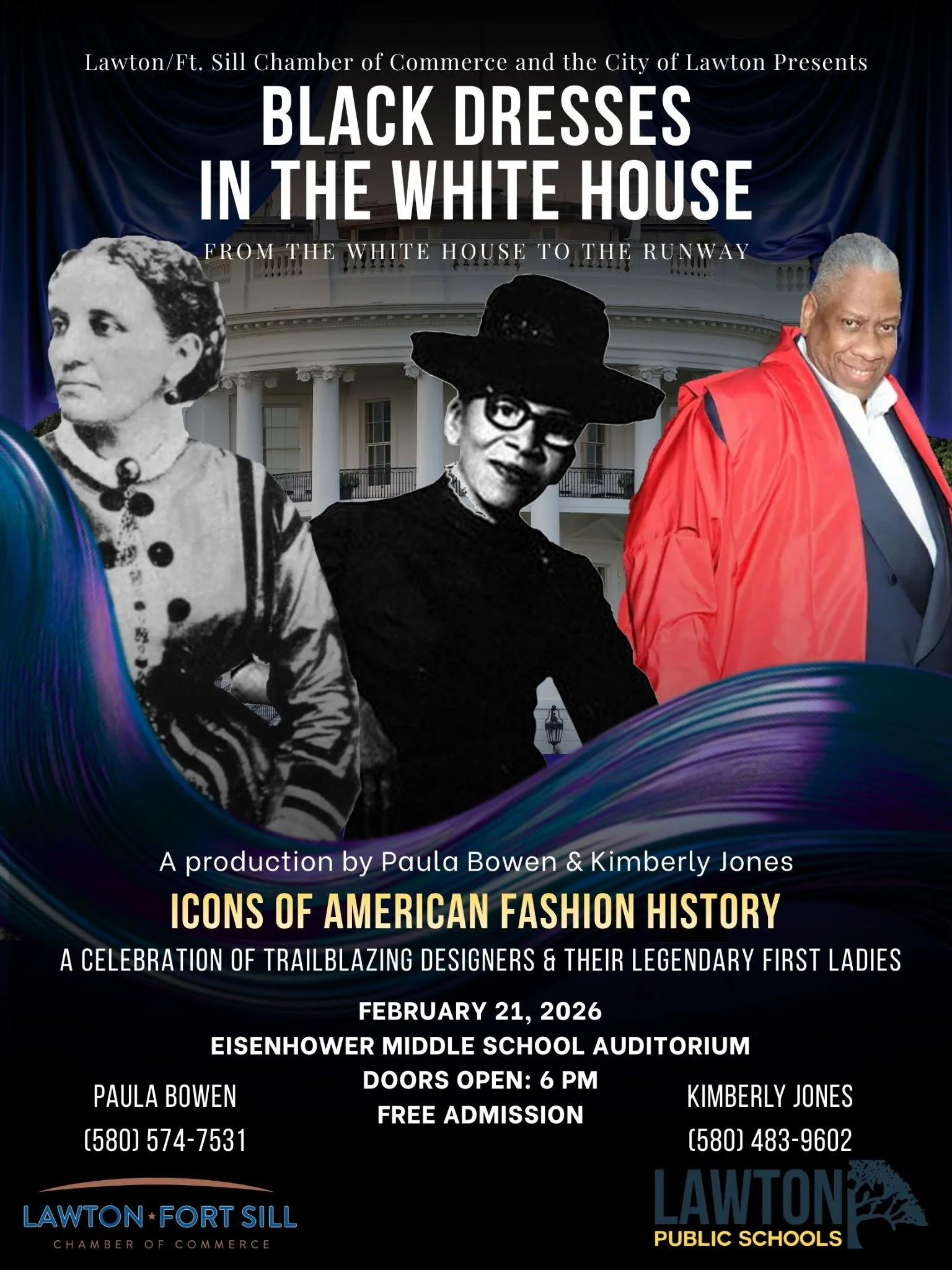 Black Dresses in the White House Stage Play: A production by Paula Bowen & Kimberly Jones Saturday, February 21, 2026 6:00 PM 7:30 PM Eisenhower Middle School 5702 West Gore Boulevard Lawton, OK, 73505 United States (map) Google Calendar ICS