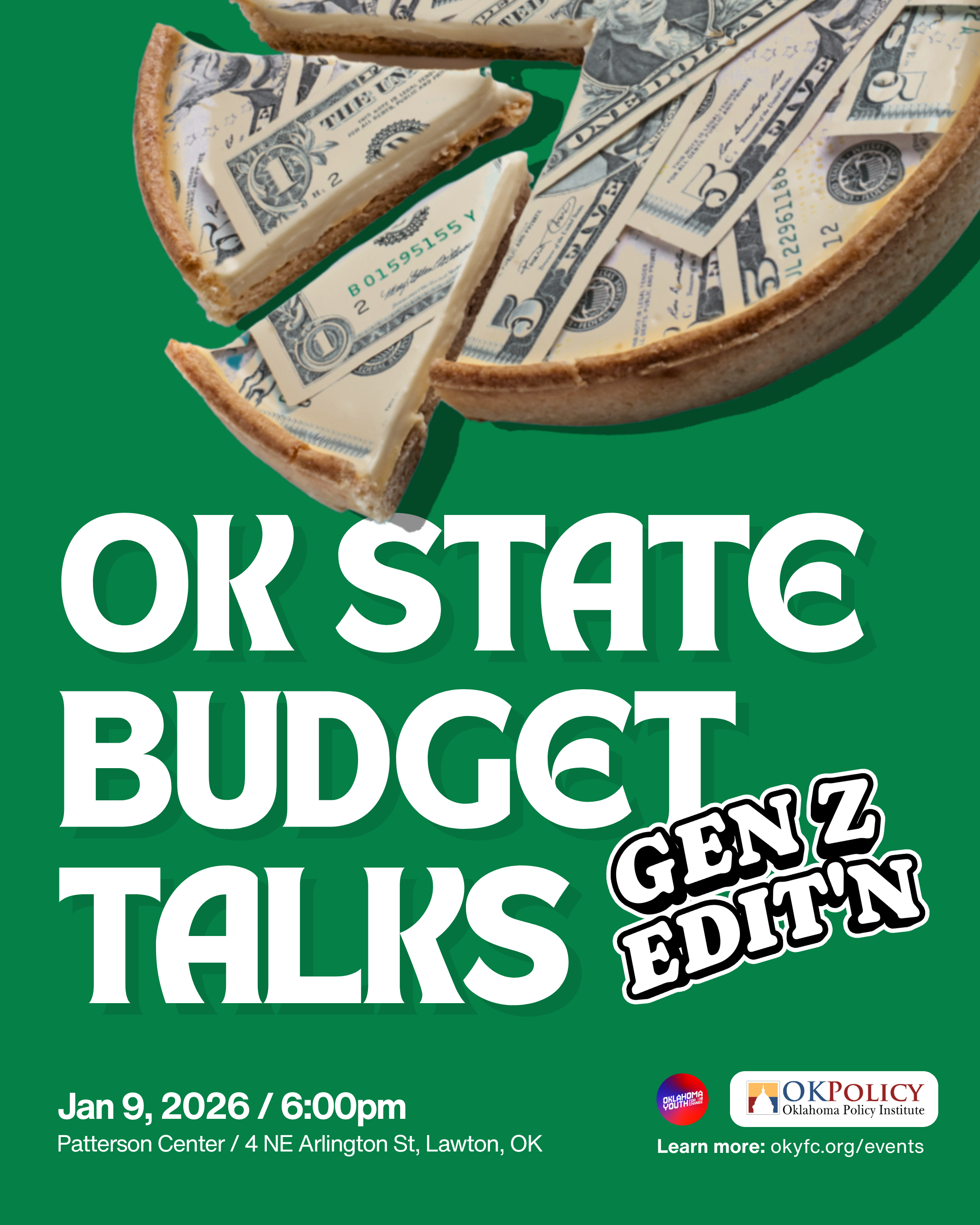 Join us for an approachable breakdown of how Oklahoma plans to spend its money in 2026. Our guest speaker, Aanahita Irani Ervin from the Oklahoma Policy Institute, will walk us through where state dollars go, why budgets matter, and how fiscal decisions affect everyday young Oklahomans. Whether you’re a student, first-time voter, young professional, or just someone trying to understand your paycheck and your state, this conversation is built for you.