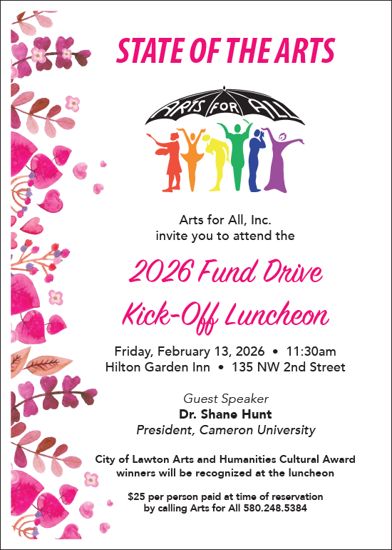 State of the Arts Luncheon Friday, February 13, 2026 11:30 AM 11:30 AM Hilton Garden Inn 135 Northwest 2nd Street Lawton, OK, 73501 United States (map) Google Calendar ICS For more info on this event visit the Lawton Fort Sill Chamber of Commerce website here!