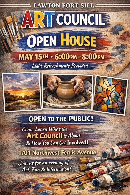 May 15th The Lawton Fort Sill Art Council invites the community to join us for an Open House! Come learn who we are, what we do, and how we work to bring art opportunities to the Lawton community. Meet our board members, see our space, and learn about our programs, including free children's workshops and community art nights. Light refreshments will be provided.