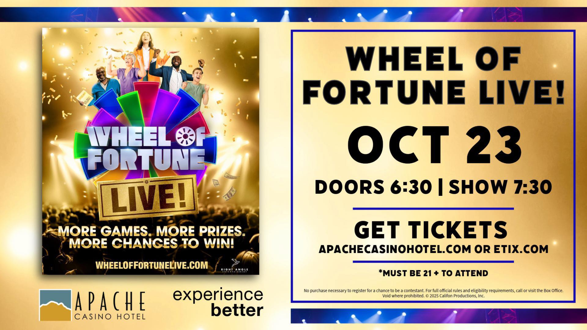 Back to All Events Wheel of Fortune LIVE! Thursday, October 23, 2025 6:00 PM 9:00 PM Apache Casino Hotel 2315 E Gore Blvd, Lawton, OK 73501 (map) Google Calendar ICS Wheel of Fortune LIVE!October 23 | 7:30 pm - 9:00 pmWHEEL OF FORTUNE LIVE!® 2025 USA TOUR COMING TO THE APACHE CASINO HOTEL ON OCTOBER 23, 2025Must be 21+ to attend. For more info click here!For tickets click here!